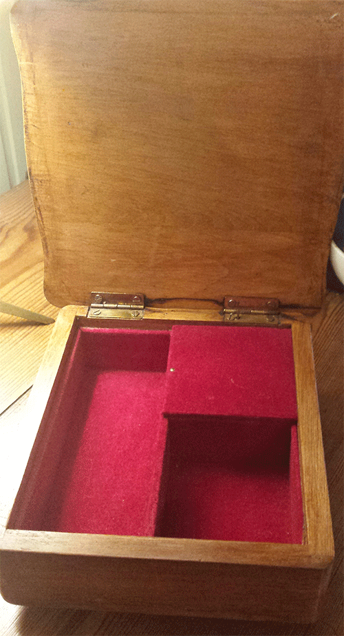 Caja de música-joyero realizada en madera y terciopalo rojo por la parte interna.Lleva un adorno floral grabado a ambos lados de la tapa. La melodía que suena es "Strangers in te night" de Frank Sinatra. Es una bonita pieza vintage de los años 60.
