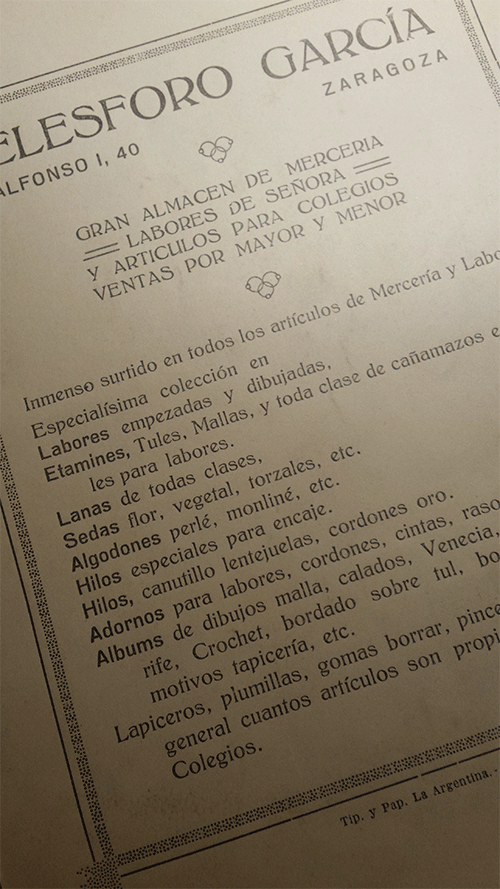 Lámina publicitaria antigua ORIGINAL del año 1906. Reverso impreso con publicidad del almacén de mercería TELESFORO GARCÍA.